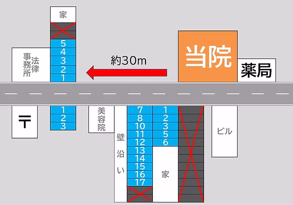 壁沿いの10台と向かい側の5台の計15台分(1番~17番)が、当院の指定駐車場です。