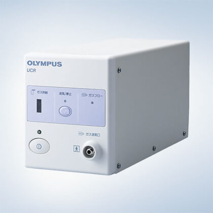 当院では「オリンパスUCR」炭酸ガス送気装置を導入しています。炭酸ガスは空気の主成分である窒素の約160倍、酸素の約13倍(あるいは空気全体と比較して約200倍)という驚異的な速さで大腸粘膜から吸収されるという特性があり、内視鏡検査後に多くの方が経験するお腹の張りや痛みといった不快な症状を軽減します。