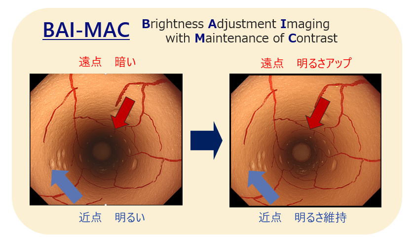 BAI-MAC(Brightness Adjustment Imaging with Maintenance of Contrast)は、従来の内視鏡検査で課題となっていたハレーション現象を抑制しながら近接部位の適切な明るさを維持し、同時に観察が困難だった中間から遠方の暗い部分まで鮮明に映し出すことを可能にした革新的システムです。これにより消化管全体を均一な明るさで捉えることができるようになり、スクリーニング検査の効率と精度が劇的に向上しています。